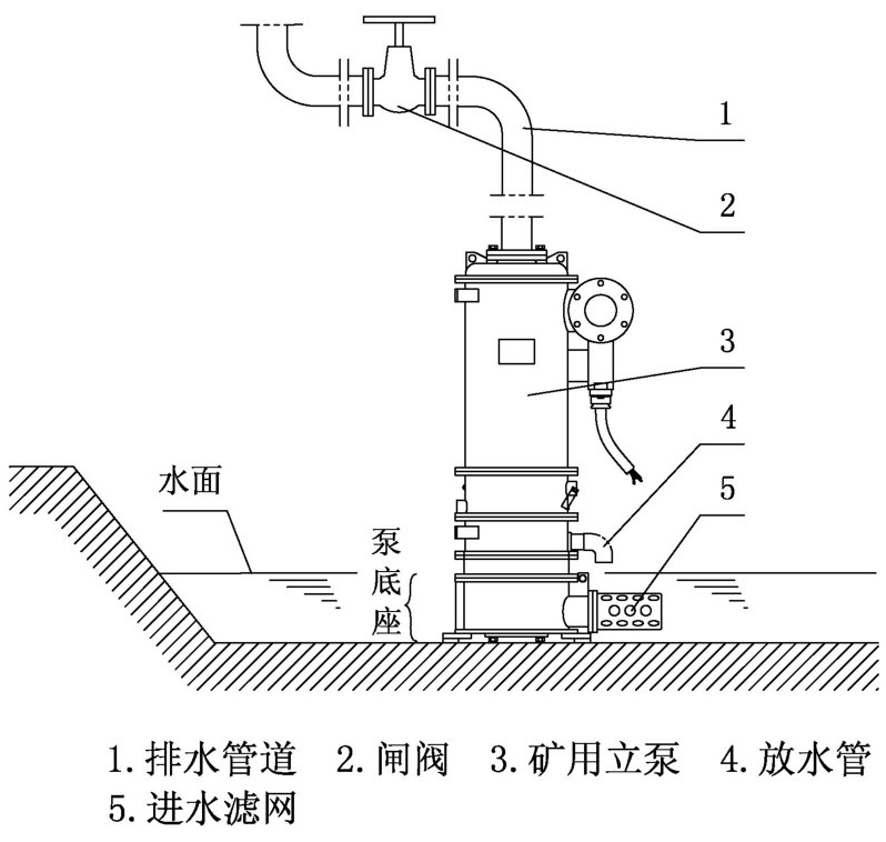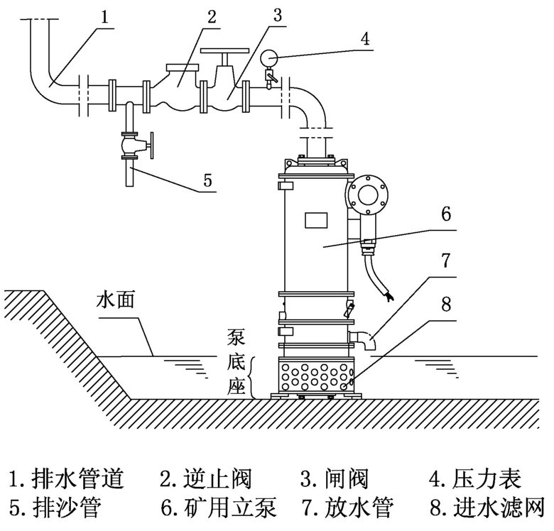 3、泵坐在岸上接吸水管排水矿用立泵坐在岸上工作时,同离心泵一样安装使用。此时需要加泄水管,将矿用立泵泄压管出来的水引到水池中(注意不能堵住泄压管)。