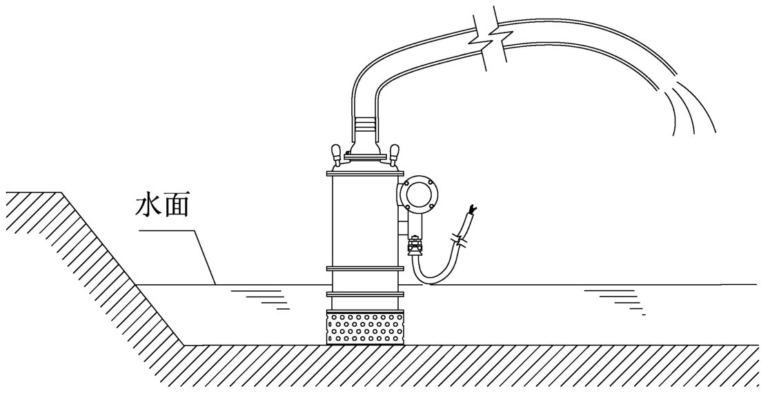 2、泵悬置在水中排水将泵悬置在水中排水,多见于软质坑底或者池底有泥沙的排水工况,这样安装可避免将泵插入泥沙中、导致水泵无法运行。将泵放置在水中,可以将泵直接固定在出水钢管上、也可以用钢丝绳将泵吊挂在水中。