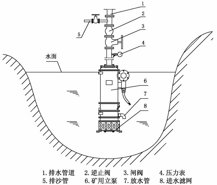 将矿用立泵直接固定在出水钢管上、也可以用钢丝绳将泵吊挂在水中、还可以将泵固定在浮筒或浮筏上。与其他方案相比,其优点为: