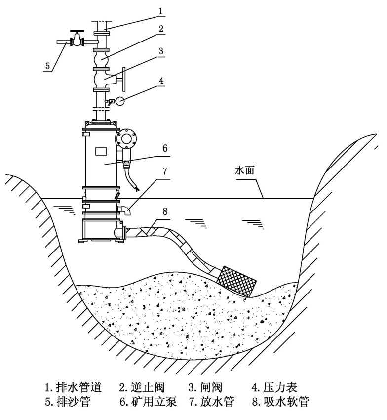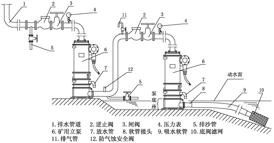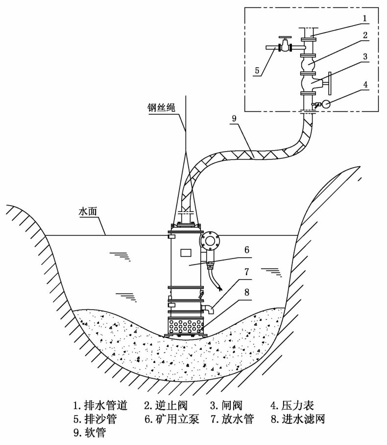 小型移动式矿用立泵(7.5kW以下)基本采用吊装加软管排水的方式,而且基本不装出水管上的阀门等原件。此外,大中型矿用立泵也有采用这样方式安装,例如:抽沙、清淤、清水池等工况。用钢丝绳将矿用立泵吊入水中,逐步下放抽沙清淤。为避免将泵直接插到泥沙中导致堵泵不出水,需要随时监控电流、压力表和出水情况。因此,这样使用对操作者的要求比较高。高扬程矿用立泵扬程较高,必须采用高压软管。高压软管非常贵,而且柔韧程度并不好,这样安装很容易发生爆管的危险,所以高扬程泵不推荐这样使用。