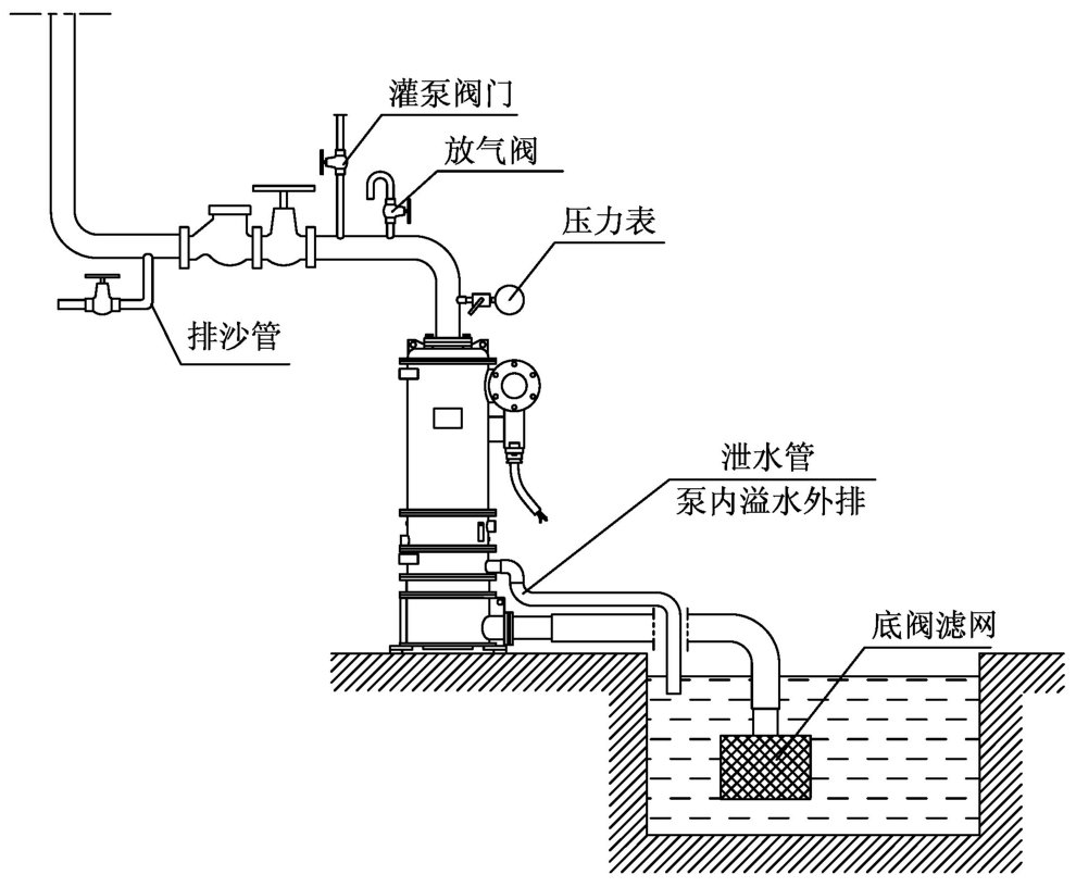 ⑦ 当水面淹没泵底座时,无需灌泵,可直接启动,此时可以使用无底阀滤网,节省费用,操作更方便。